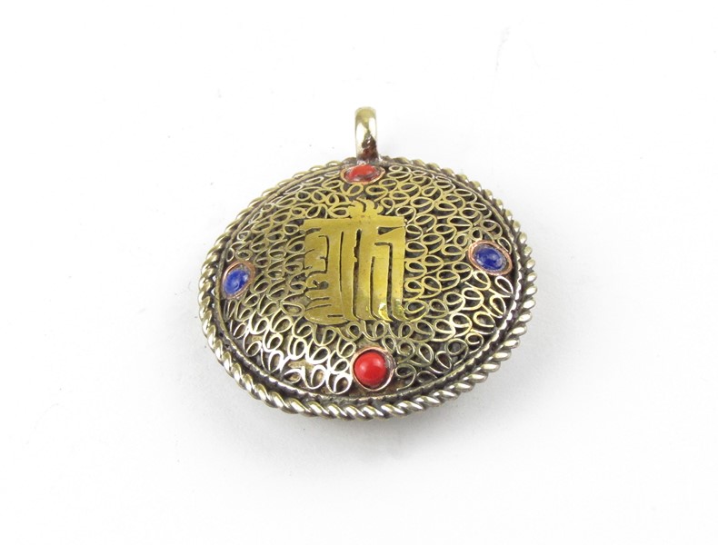 Tibetský oboustraný přívěšek z kovu byl vyrobený v Nepálu. Tvar přívěšku je kulatý, lehce vypouklý. Barva kovu je žlutá. Obě strany přívěšku jsou zdobené jemnou filigránskou prací a doplněné barevnými perličkami. Ve středu je znázorněn buddhistický symbol ÓM, psaný v nepálštině. Na straně druhé je symbol kříže. Obvod je zdoben tepáním.