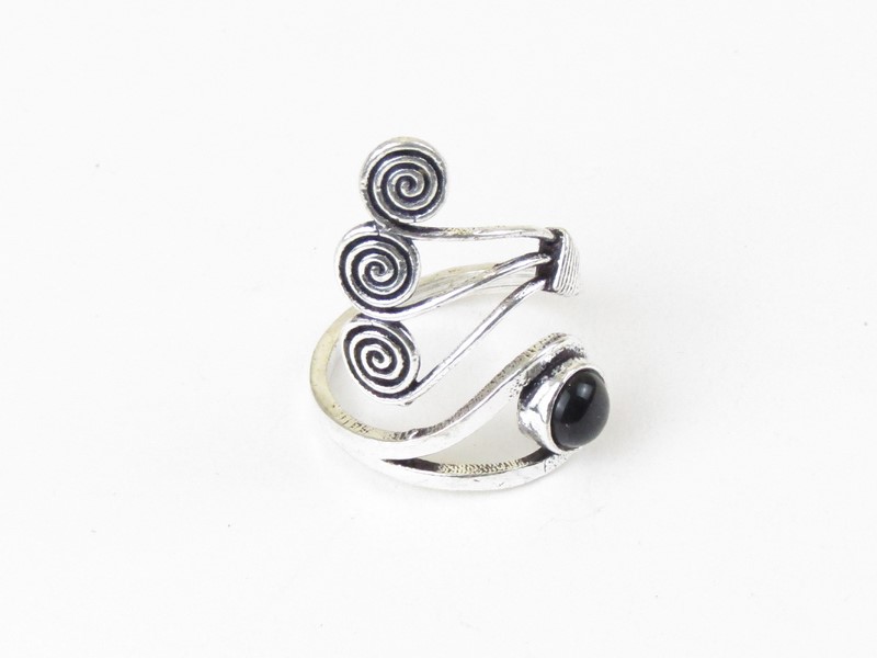 Krásný větší prstýnek byl vyroben v Indiiz obecného bílého kovu. Horní stranu prstýnku zdobí tři něžné spirálky a jeden kulatý polodrahokam - černý turmalín, vsazený do lůžka, které je umístěné ve tvaru kapky. Horní strana prstenu je nastavovací.