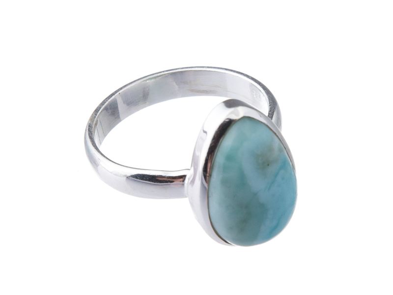 Velice pěkný stříbrný prstýnek s polodrahokamem larimarem byl ručně vyroben v Indii. Polodrahokam je vsazen do stříbrného lůžka a má tvar kapky. Prstýnek je ručně vyroben v hladkém provedení, bez tepání.