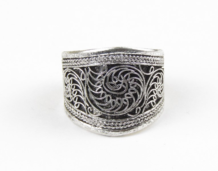Krásný prstýnek byl vyroben v Nepáluz obecného bílého kovu. Uprostřed prstenu je zobrazena spirála. Celá horní plocha prstenu je jemně zdobená filigránskou prací. Spodní strana je hladká, bílá.
