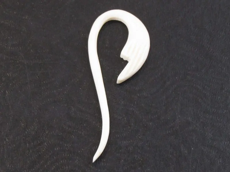 Hladký roztahovák do uší byl vyrobený v Indii z kosti. Barva je bílá. Roztahovák je na jednom konci zdoben vyřezaným listem. Konec, který se nasazuje do ucha, je zúžený.