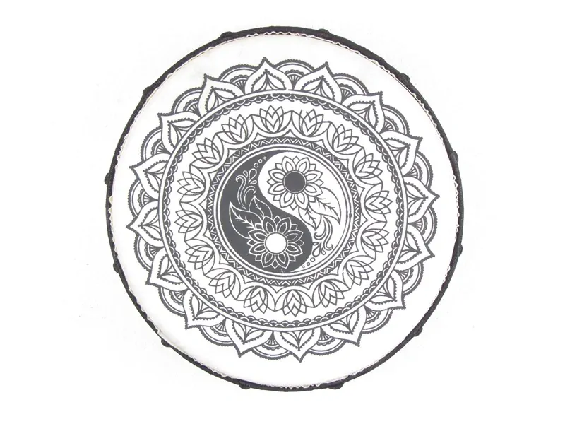 Krásně malovaný šamanský buben byl ručně vyroben v Indonésii. Kozí kůže je napnutá na kulatý černý dřevěný rám. Rám je obalen tkanou černou textilií. Přední strana bubnu vyniká ruční malbou symbolu jin-jang v květu v černé barvě. Zadní strana je vypletena černými provázky.