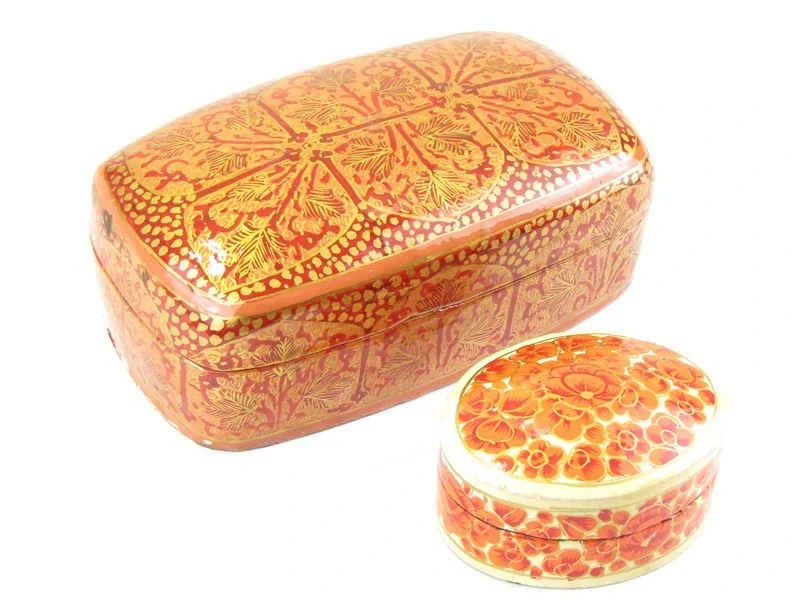 Pěkný set dvou krabiček, s malovaným květinovým vzorem, ručně vyrobených v Indii v oblasti Kašmíru. Převládající barva je červená a zlatá. Krabička má horní víko otevírací. Vnitřní prostor a spodní strana je černá, nezdobená. Tvar krabiček je ovál.