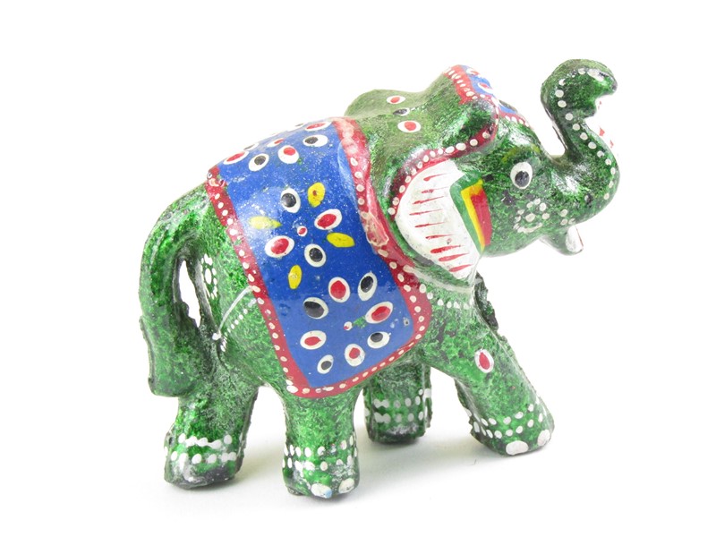 Soška zeleného slona byla vyrobena v Indii z epoxidové pryskyřice. Chobot slona směřuje nahoru pro štěstí. Je velice pěkně barevně ručně pomalován.