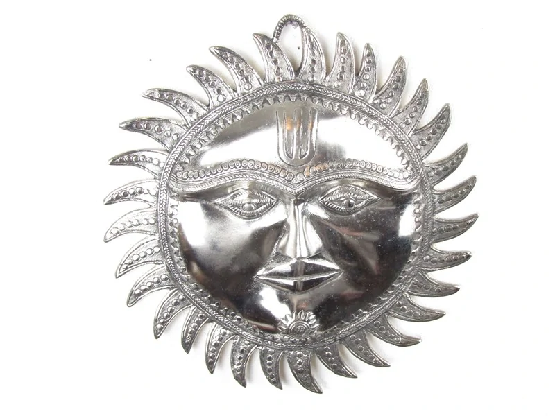 Luxusní větší slunce z bílého obecného kovu bylo vyrobené v Indii. Z přední strany je slunce jemně prořezáváno a dekorováno. Obvod vypouklého kruhu slunce je zdobený paprsky. Dekorace se věší na stěnu pomocí kulatého otvoru v horní části paprsků.