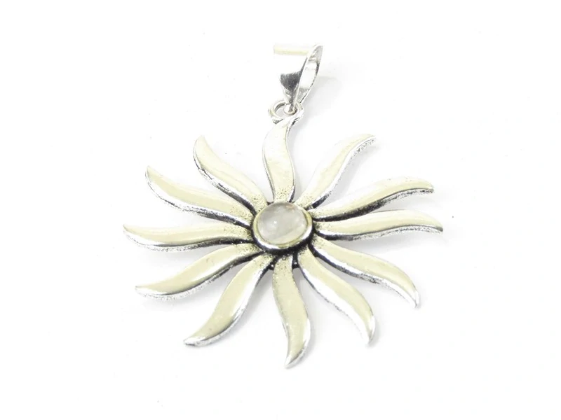 Přívěšek z obecného bílého kovu byl vyroben v Indii. Z kovu je vyřezán tvar slunce. Ve středu sluníčka je vsazen polodrahokam růženín. Jde o velice jemnou a krásnou práci.