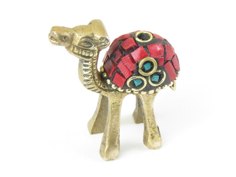 Malá soška velblouda byla vyrobena v Indii z mosazi. Z přední i zadní části je soška vykládaná drtí barevných kamínků. Kamínky jsou v barvě červené. Na hřbetě má velbloud jeden malý otvor na vonnou tyčinku. Socha stojí na dlouhých čtyřech nohách.