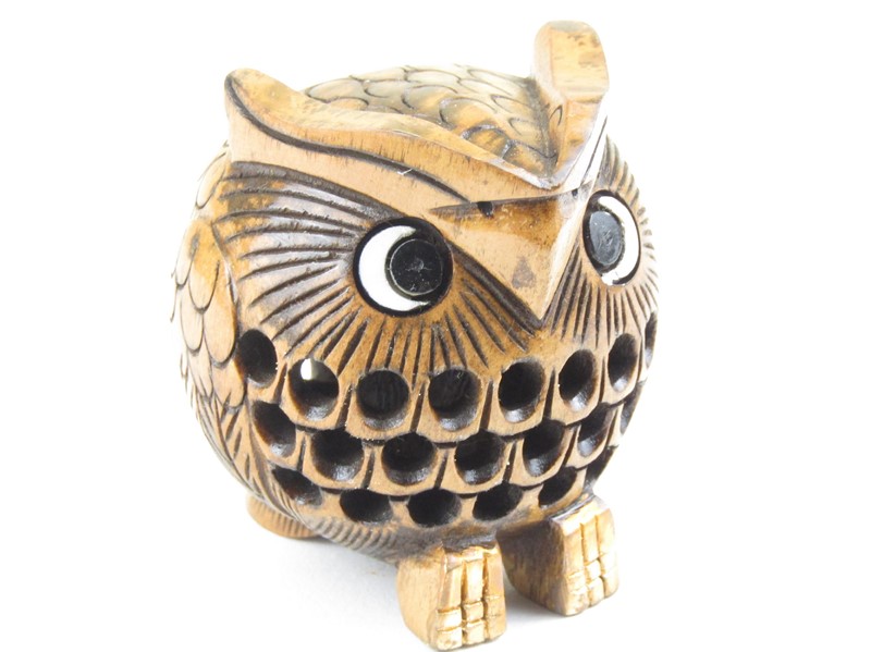 Ručně vyřezávaná sova ze dřeva mangovníku hnědé barvy byla vyrobená v Indii. Uvnitř těla, z jednoho kusu dřeva, je ještě vyřezána jedna sovička. Na celé ploše sovy je krásná řezba, kdy přes otvory v těle můžeme spatřit malou sovu. Tělo sovy má tvar koule. Oči jsou dobarveny barvou bílou a černou. Na nohách je zlatěnka.