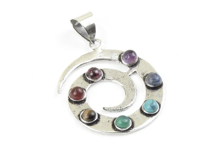 Kulatý přívěšek z obecného bílého kovu byl vyroben v Indii. Tvar přívěšku je spirálka, kterou doplňuje sedm polodrahokamů v barvách čaker. Zadní strana je hladká, bílá.