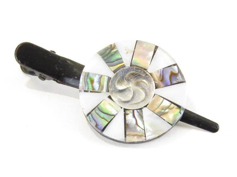 Černá kovová sponka do vlasů byla vyrobena v Indonésii. Na horní straně spony je kulatá ozdoba ze světlé perleťoviny a pauy, vsazená do černé epoxidové pryskyřice. Ve středu je světlý kruh z perletě s vyrytou květinou.