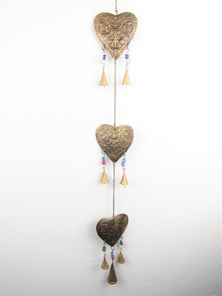 Srdce byly vyrobené z kovu v barvy žluté, v Indii. Spodní a horní části tří srdcí na řetízku nad sebou jsou doplněny žlutými kroužky, na kterých jsou napojeny krásné zvonky v různých velikostech. Nad každým zvonečkem jsou barevné skleněné korálky. Korálky jsou na řetízek napojeny očkem a pokud by barevně neladily s interiérem, lze je dát pryč. Plocha srdcí je krásně zdobená tepáním a mírně vypouklá.