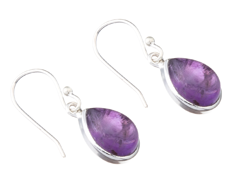 Originální visací stříbrné náušnice jsou vyrobeny ve tvaru kapky. Do hladkého lůžka je vsazen polodrahokam fialový ametyst s krásnou barvou. Provedení je hladké, bez zdobení.