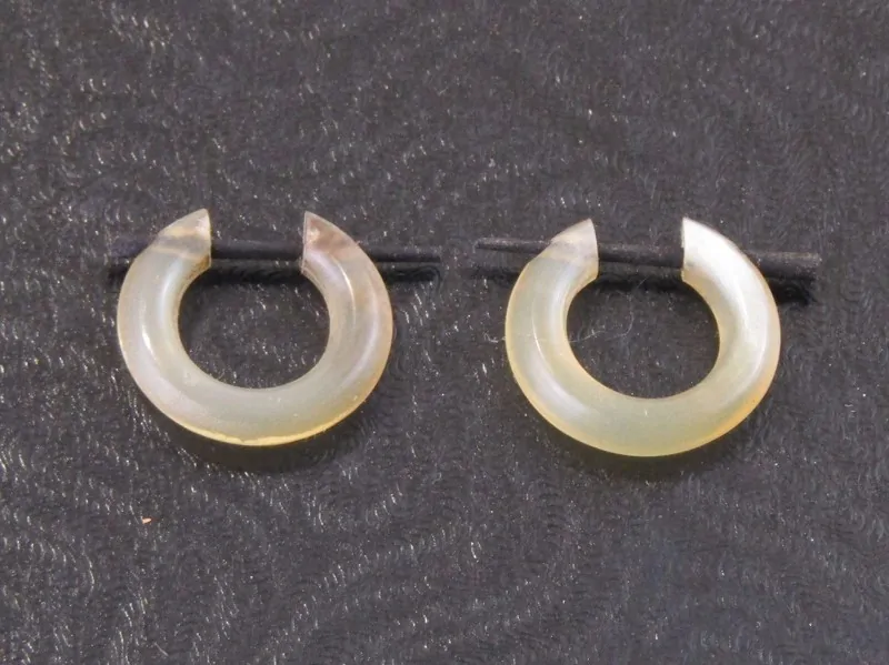 Náušnice (pár) byly ručně vyrobené v Indii z polymeru. Mají tvar neuzavřeného kruhu. Náušnice jsou vyrobené v průhledné světle žluté barvě. Zapínaní je na dřevěnou černou tyčinku.