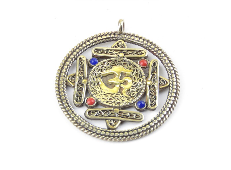 Tibetský oboustraný přívěšek z kovu byl vyrobený v Nepálu. Tvar přívěšku je kulatý. Barva kovu je žlutá. Obě strany přívěšku jsou zdobené jemnou filigránskou prací a vykládané barevnými perličkami. Ve středu prořezávaného kruhu tvarem kálačakry je vyobrazen buddhistický symbol ÓM. Na straně druhé je dorje v kruhovém středu kálačakry. Obvod je zdoben tepáním.