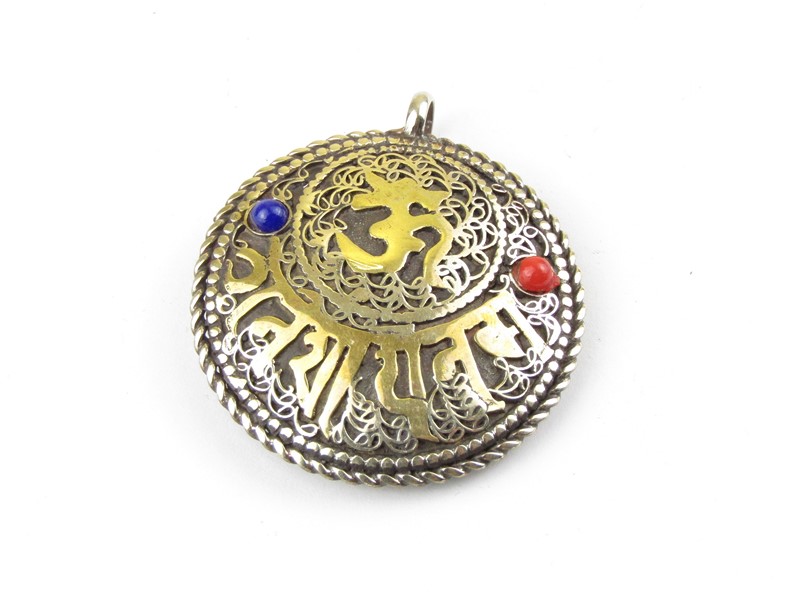 Tibetský oboustraný přívěšek z kovu byl vyrobený v Nepálu. Tvar přívěšku je ze dvou kulatých částí, lehce vypouklý. Tyto dva kruhy jsou spolu spojené a mají mezi sebou menší prostor. Barva kovu je žlutá. Obě strany přívěšku jsou zdobené jemnou filigránskou prací a barevnými perličkami. Ve středu je znázorněn buddhistický symbol ÓM, který má ve spodní části vykládaní mantrou. Na straně druhé je symbol ÓM. Symboly jsou vsazeny do středového kruhu kálačakry. Obvod je zdoben tepáním.