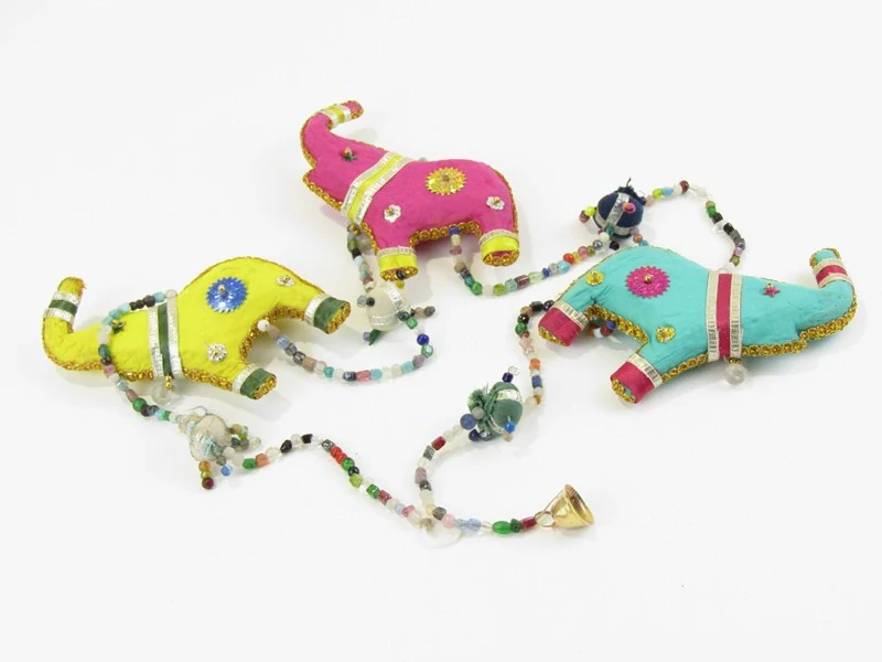 Závěsná látková dekorace ze tří slonů byla ručně vyrobená v Indii, v oblasti Rajastán. Sloni jsou z pestrých barevných kousků bavlněných látek na pevném podkladu a jsou doplnění pestrou viskózovou stužkou a korálky. Navázáni jsou pod sebou na bavlnu s barevnými korálky. Bavlněná šňůra je zakončená kovovým zvonečkem ze spodní strany a na horním konci je kroužekna zavěšení dekorace.