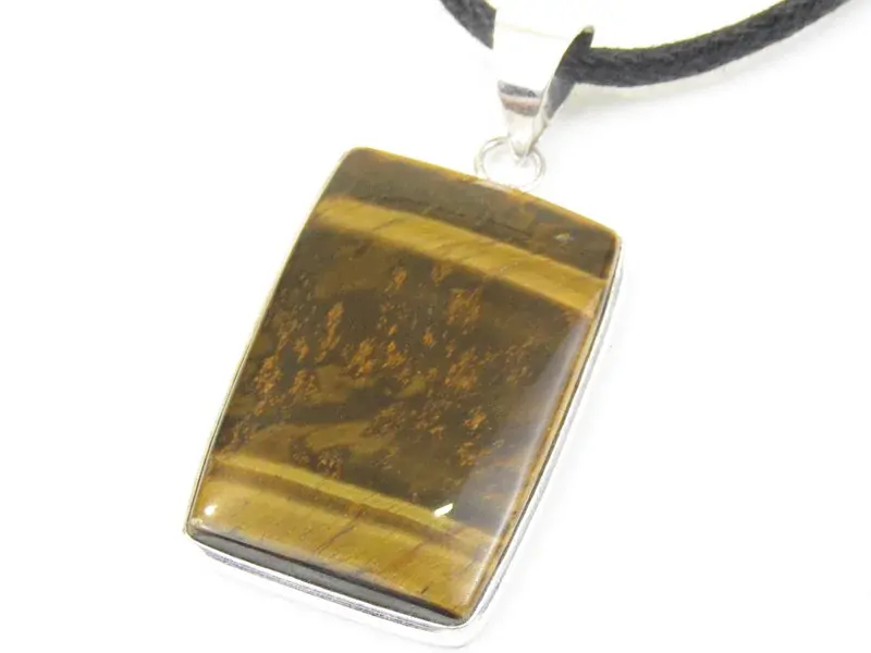 Překrásný obdélníkový polodrahokam medově hnědé barvy - tygří oko je vsazen do bílého obecného kovu. Kov lemuje obvod kamene a horní část kovové části je doplněna očkem na protažení bavlnky. Bavlnka je součástí přívěšku. Bavlnka je kulatá, barvy černé a zavazuje se na uzlík.