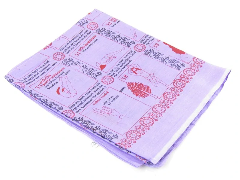 Velice příjemný šál byl vyroben v Indii z lehké 100% bavlny.Šál je v barvě fialové. Plocha šálu je potištěná červeně 60 jógovými pozicemi a jejich stručným popisem v anglickém jazyce. Pozice a lem je zdoben tištěným květinovým motivem.