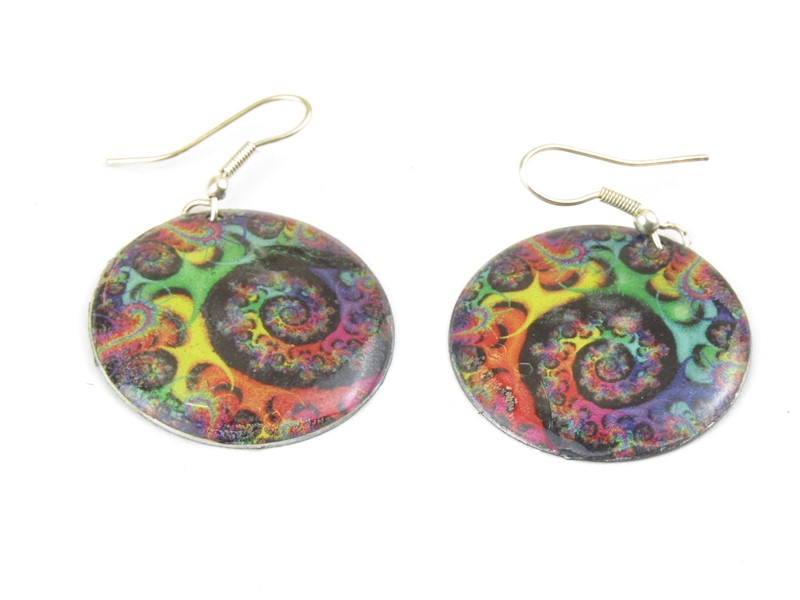 Kovové náušnice jsou vyrobeny z lehkého obecného kovu. Barevný potisk zobrazuje spirálu. Barvy jsou voleny v černých, fialové, zelených, žlutých a červených tónech. Náušnice jsou příjemné na nošení a jsou lehké. Styl náušnic je visací.