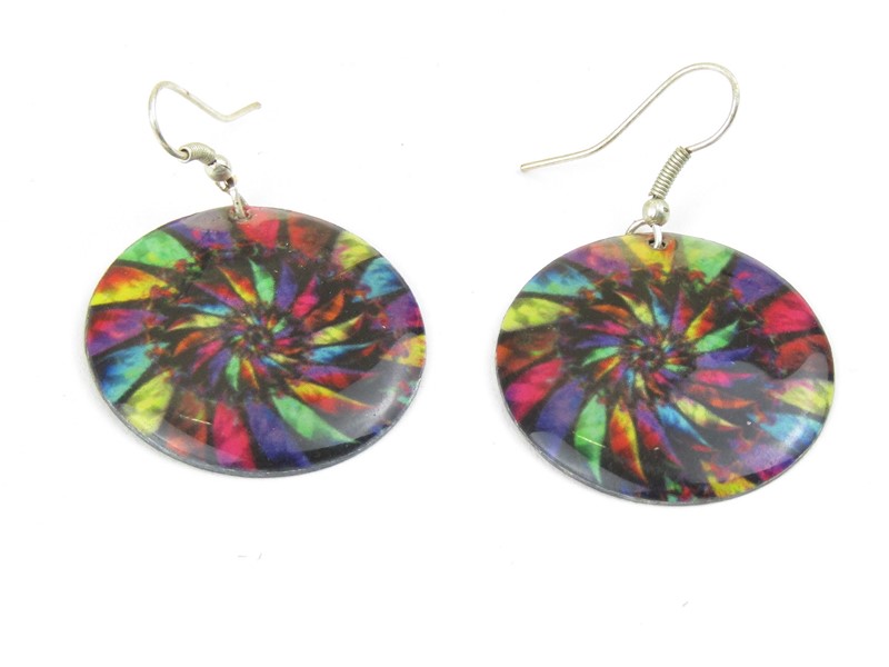 Kovové náušnice jsou vyrobeny z lehkého obecného kovu. Barevný potisk zobrazuje spirálu. Barvy jsou voleny v černých, fialové, zelených, žlutých a červených tónech. Náušnice jsou příjemné na nošení a jsou lehké. Styl náušnic je visací.