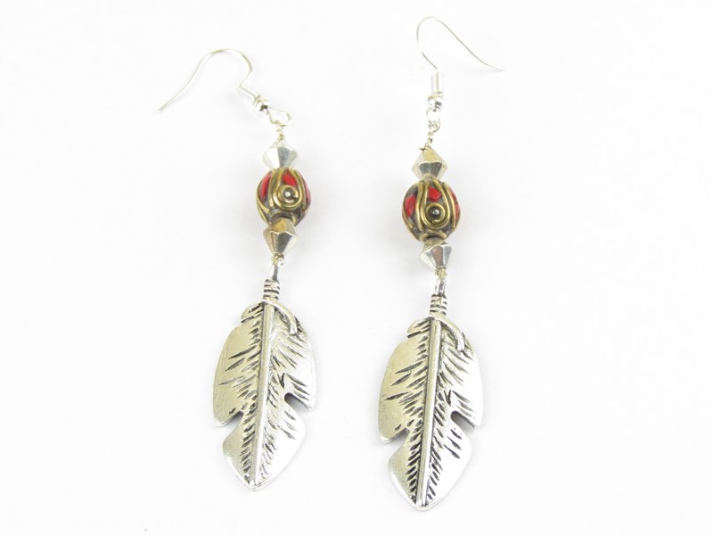 Náušnice tibetského stylu visacího typu jsou složené z korálku, vykládaného drtí kamenů v barvě čeervené a podélného přívěšku z obecného bílého kovu s motivem peříčka. Háčky náušnic jsou z bílého obecného kovu.