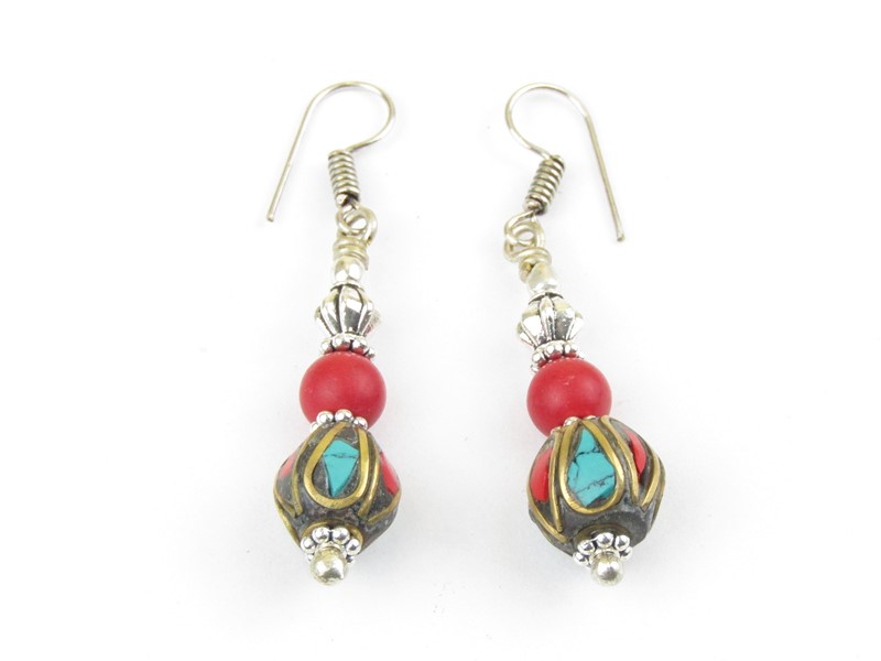 Náušnice visacího typu jsou složené z tibetskéhokorálku vykládaného drtí kamenů v barvě tyrkysu a červeného korálu. Nad korálkem je malý kulatý červený korálek. Ozdobené jsou krásnými komponenty z bílého obecného kovu. Háčky náušnic jsou z bílého obecného kovu.