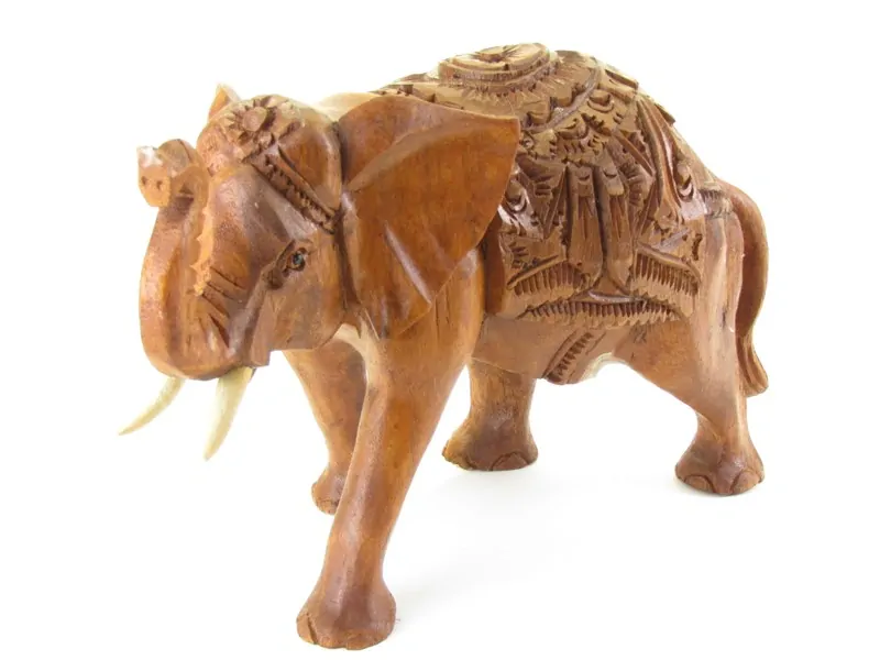 Nádherná, ručně vyřezávaná socha slona z tropického dřeva suar z Indonésie. Řezba je vyvedena do nejjemnějších detailů. Chobot slona směřuje směrem nahoru. Kly jsou světlé barvy. Barva dřeva suar je hnědá.