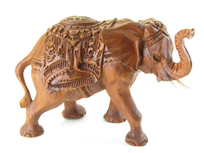 Nádherná, ručně vyřezávaná socha slona z tropického dřeva suar z Indonésie. Řezba je vyvedena do nejjemnějších detailů. Chobot slona směřuje směrem nahoru. Kly jsou světlé barvy. Barva dřeva suar je hnědá.