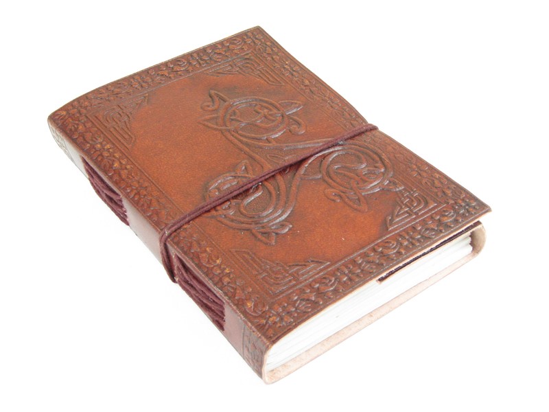 Velice krásný zápisník byl ručně vyrobený v Indiiz ručního papíru. Horní a spodní deska bločku je z velbloudí kůže, kterou na horní straně zdobí ručně vyražený keltský symbol trojné bohyně a spodní strana je zdobena pěknou kulatou mandalou. Mezi desky z kůže je všito 100 bílých pevných listů, z přírodního papíru. Notýsek se zavazuje na hnědou bavlnku.